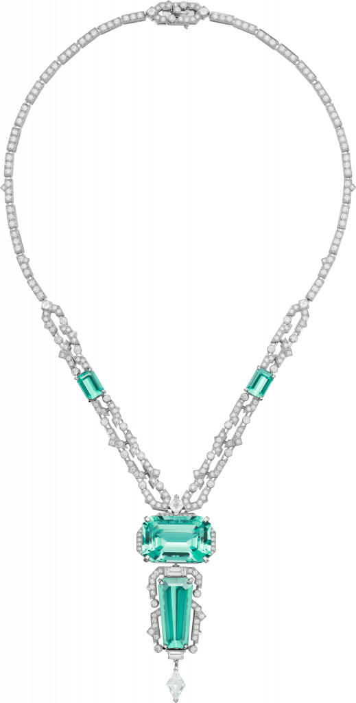 Mélanie Laurent wore a Cartier necklace set in platinum to the screening of Les Olympiades during the 74th Annual Cannes Film Festival on July 14th. Cartier Sixième Sens High Jewellery necklace, platinum, green beryls, green tourmalines, diamonds (credit: Cartier)