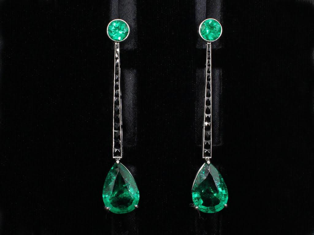 (credit: Kwiat) Kwiat Legacy Colombian Emerald and Onyx Stiletto Earrings, with approximately 5.0 carat each pear shaped Colombian emerald drops, set in platinum