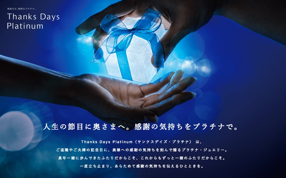Thanks Days Platinum is the largest non-bridal platinum jewellery brand in Japan with over 600 doors, for the 12th year of its marketing campaign. A new video is launched in June 2018, and editorial ads are featured in magazines in order to maximise the presence of new TDP. For more information, please visit here